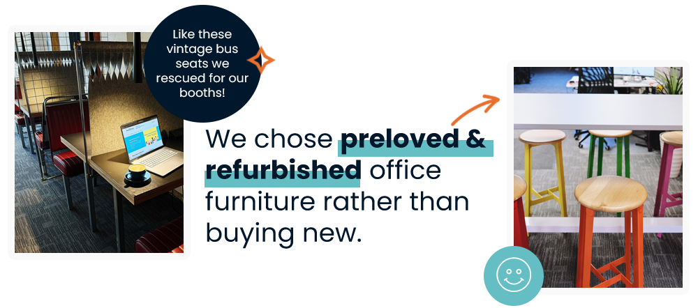 We’ve also made a conscious effort to rethink how our office and coworking space is furnished. Instead of buying shiny and new, we’ve chosen upcycled, preloved and refurbished furniture wherever possible. From the rescued bus seats that now make up our booth seating, to the colourful refurbished bar stools in our entrance area. We even bought a second hand refurbished coffee machine. We're proud that our office shows that sustainability can be practical, affordable - and still look really great too.